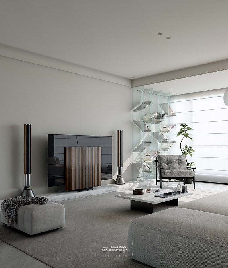 電視墻設計也很有心思,電視嵌在墻里,兩邊是木質格柵,簡約中帶著點自然的溫馨。兩側的黑色柱狀音響,看起來就很高級,放起音樂來,整個客廳都像在開小型音樂會。
