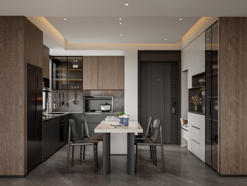 廚房部分:櫥柜主要采用木色與深色調結合,沉穩大氣。部分櫥柜門為玻璃材質,內置燈光,既方便查找物品,又增添了空間的精致感。