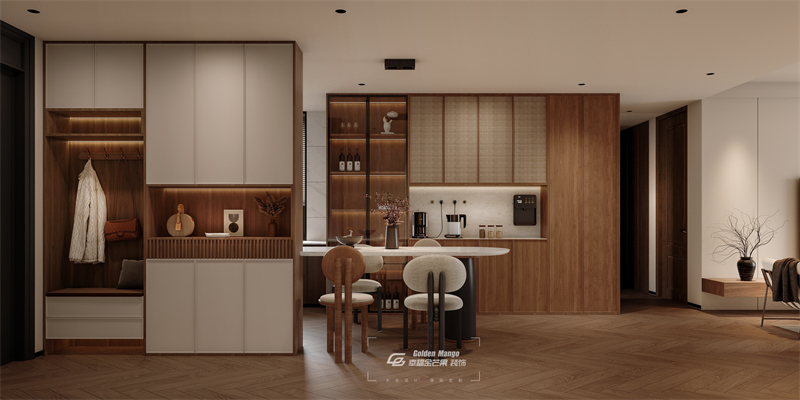 左側是入戶區域,設有帶燈光的儲物柜和掛衣區,方便收納衣物與隨身物品,細節處盡顯貼心。中間的餐廚空間,餐桌造型簡約,搭配造型別致的座椅,既適合日常用餐,也可作為休閑小吧臺。