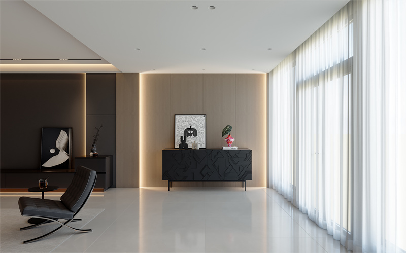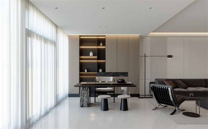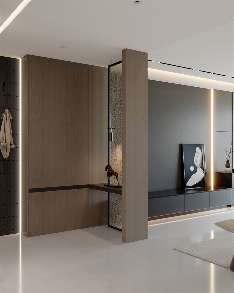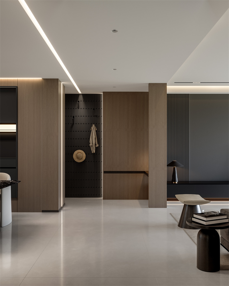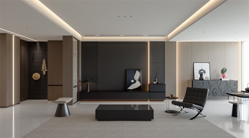 作為 245㎡大平層的核心場域,客廳以 “少即是多” 的內核,演繹意式極簡的精髓。沒有冗余裝飾,僅用淺灰色絨面沙發搭配啞光黑懸浮茶幾,奠定冷靜雅致的基調;淺木色墻板與白色巖板背景墻碰撞,在材質對比中透出細膩質感。懸浮吊頂嵌入線性暖光,弱化空間邊界的同時,給硬朗線條裹上一層柔光,隱形收納墻藏起生活瑣碎,只留開闊通透的場域 —— 在這里,窩在沙發追劇、與家人閑談,每一刻都是被質感包裹的松弛。