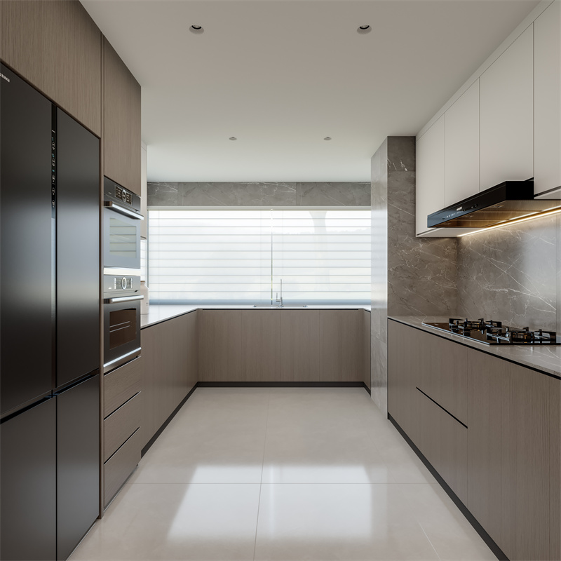 意式極簡的美學,從不缺席煙火繚繞的廚房。U 型布局最大化利用空間,淺灰色極簡柜面搭配隱形拉手,線條利落干凈,徹底告別雜亂感;石英石臺面耐高溫、易清潔,兼顧實用性與顏值,嵌入式電器與柜體無縫銜接,讓空間更顯規整統一。燈光采用嵌入式筒燈與臺面燈帶結合,既保證操作區的明亮,又避免強光刺眼,讓下廚的每一個動作,都在規整有序的環境中完成 —— 在這里,煙火氣不再與精致相悖,利落的設計讓做飯也成為一種沉浸式的治愈體驗。