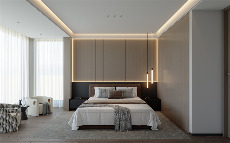 臥室是卸下疲憊的私密空間,以 “靜謐、舒適” 為核心,將意式極簡的溫柔發揮到極致。淺木色背景墻搭配米白色軟包床頭,自帶溫潤質感,弱化了硬朗線條的冰冷;無主燈設計搭配床頭壁燈與懸浮吊頂燈帶,光線柔和不刺眼,營造出慵懶的睡眠氛圍。定制的懸浮衣柜采用無拉手設計,與墻面融為一體,既節省空間,又保持視覺整潔,預留的梳妝臺與衣柜相連,兼顧收納與美妝需求。在這里,隔絕外界的喧囂,每一次躺下,都能被溫柔包裹,一夜好眠,是設計給予生活最好的饋贈。