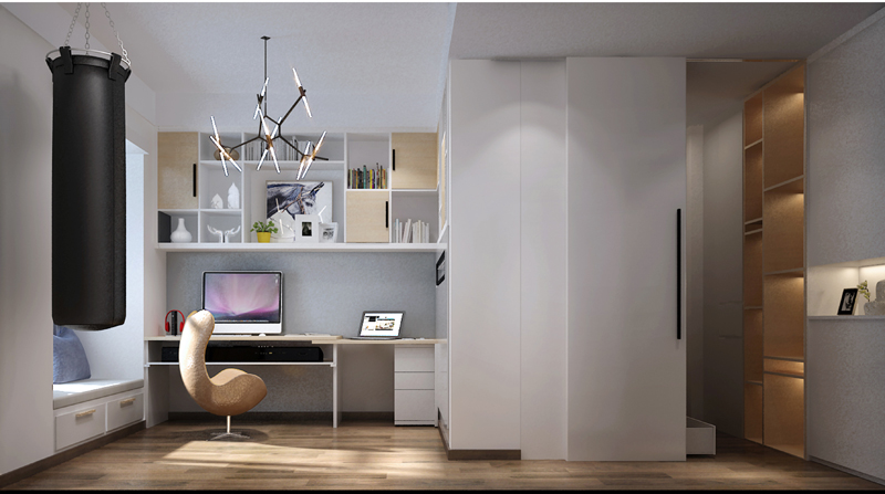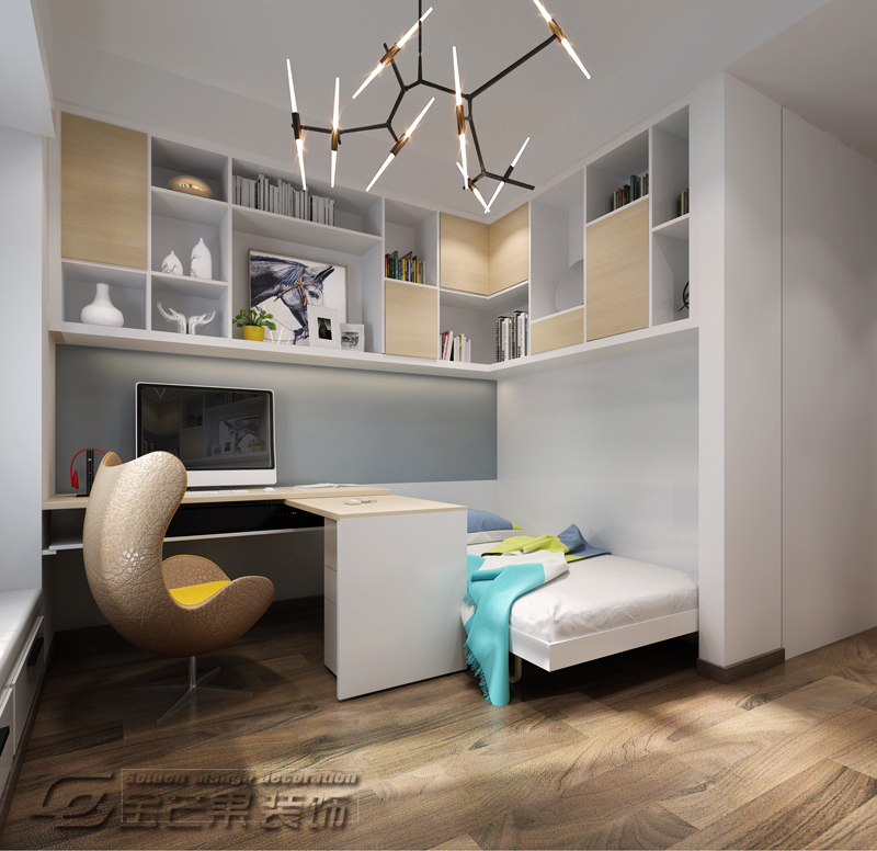 ▲ 書房地面鋪設(shè)木質(zhì)地板,純凈的白色墻面,墻面轉(zhuǎn)角書柜,一張實(shí)木書桌,線條利落,小床連接儲(chǔ)物柜的設(shè)計(jì),讓書房兼具客房功能。