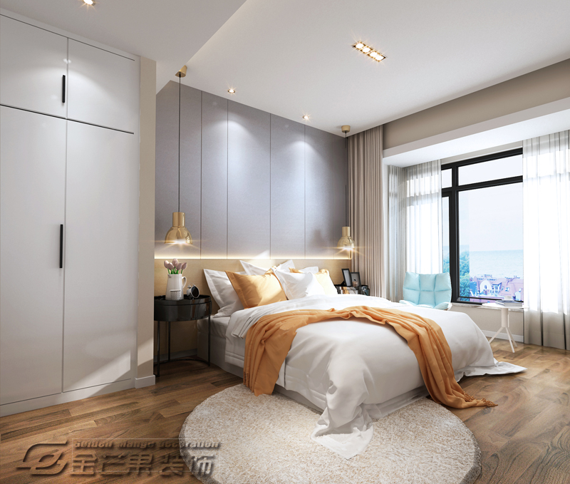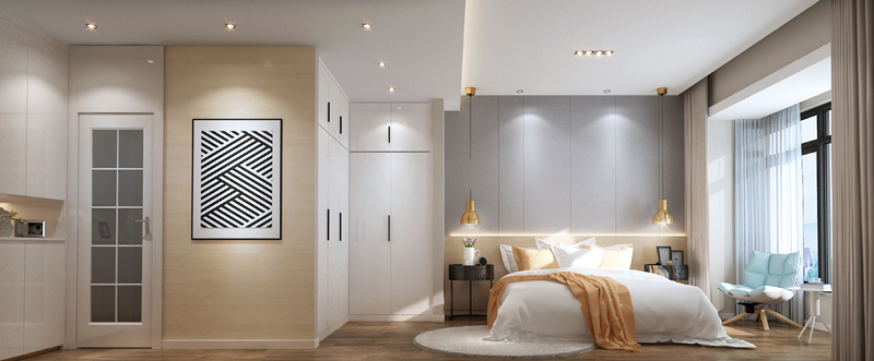 ▲ 主臥整體設(shè)計(jì)營(yíng)造出一個(gè)絕對(duì)放松的睡眠環(huán)境,棉麻的色澤與觸感的柔軟,都讓心瞬間得到完全沉浸式的舒展。轉(zhuǎn)角式的衣柜,男女主人衣物各享一半,兩相安然,歲月靜好。