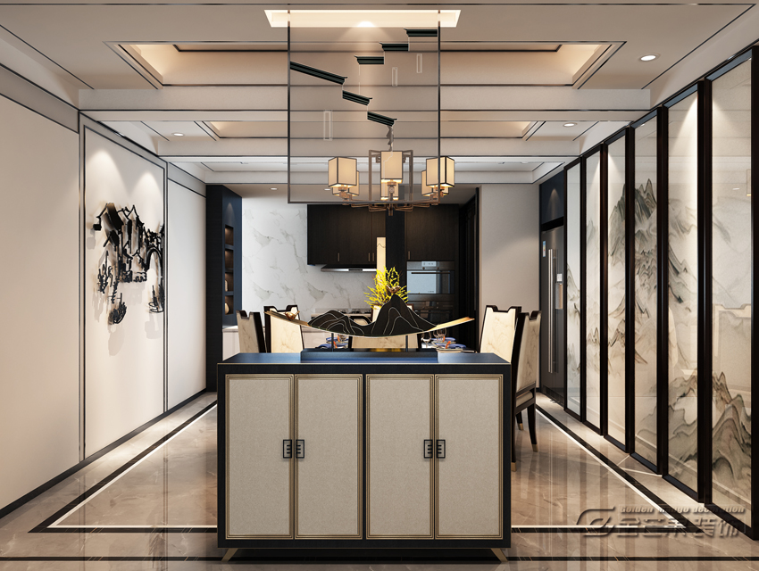 餐廳在設計上利用斗柜將客餐廳區域區分開來,背景的設計將水墨畫作為主體,后面的燈光設置讓空間的想象得以延伸,找尋的是江南水鄉里枕河人家的低吟淺唱。