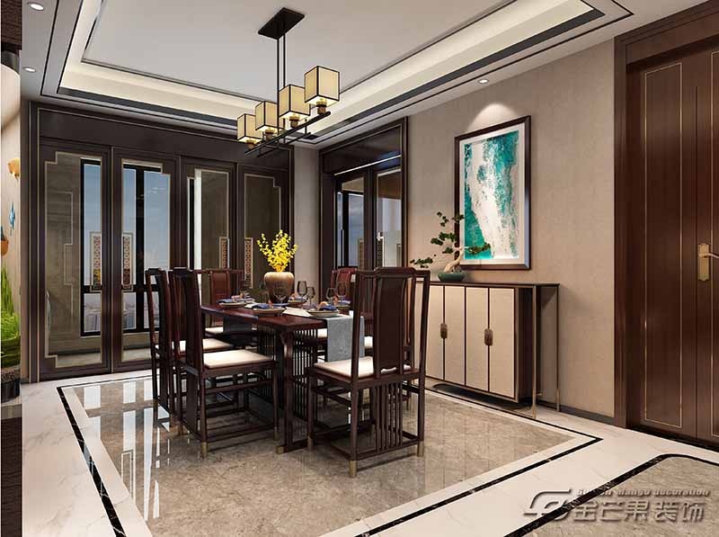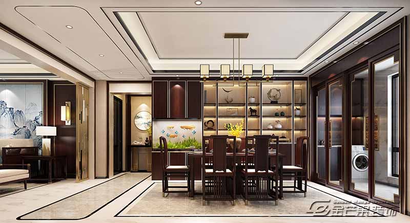 與廚房相連的餐廳,布置的也比較仿古化,實(shí)木六人桌與背景墻上壁畫、嵌入式魚缸相得益彰。方形的天花上垂墜的吊燈,高低間展現(xiàn)出古雅韻調(diào)。