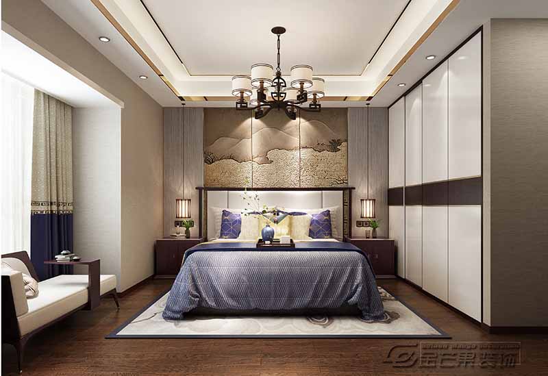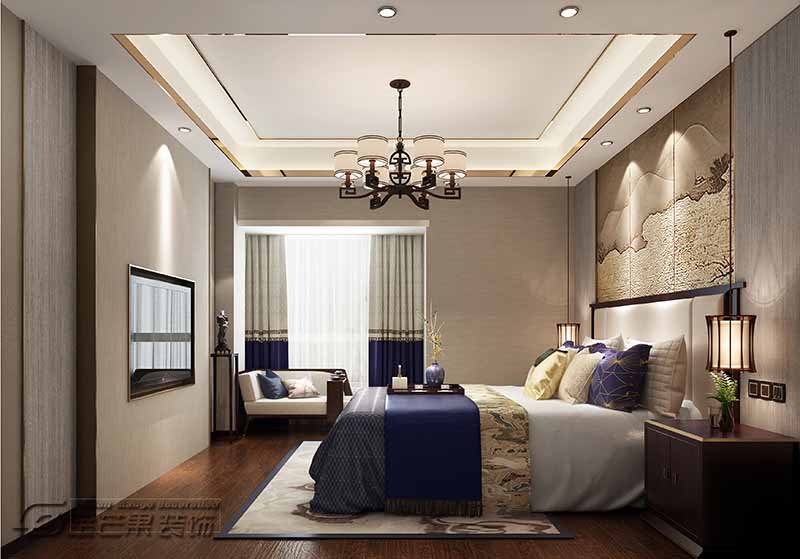 臥室運(yùn)用暖色調(diào)的墻布做裝飾,床品素雅色調(diào)與窗簾呼應(yīng),形成視覺上的整體性。床頭吊燈色調(diào)清雅,與山水畫碰撞,燈帶線條與床頭宛如一體。局部一抹藍(lán)色,打破厚重點(diǎn)綴出活力。