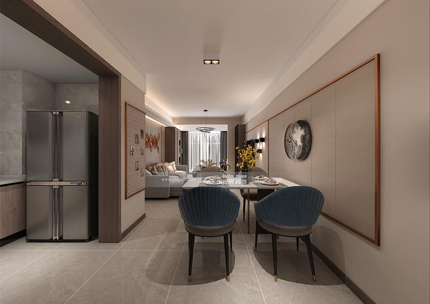 開放式廚房更顯主人的包容,L型的布局提升烹飪效率,選用灰色的地磚,干凈、美觀。雙開門的冰箱是新鮮蔬菜的一大保障。