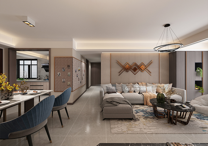 客廳的設(shè)計布局沒有多余的東西。舒適的沙發(fā)加上大屏電視,在會客時舒心交談,關(guān)上燈則是影院級的享受。背景墻是中式風(fēng)格的體現(xiàn)。燈帶散發(fā)的光芒則渲染了溫馨、溫暖的氣氛。