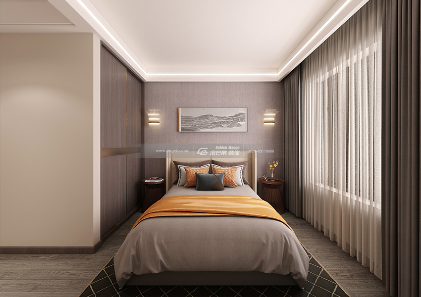 臥室并沒有吊燈之類的主燈,而是運(yùn)用燈帶加以代替,在保護(hù)眼睛的同時也有不錯的照明。床頭壁畫也是中式風(fēng)格的體現(xiàn),深色的窗簾也是睡眠的一大保障。