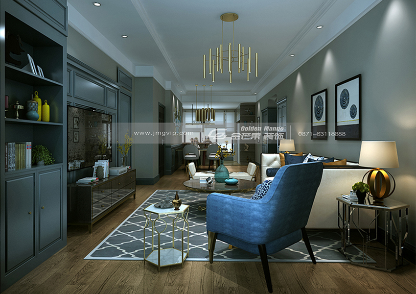 簡單明快也是美式風(fēng)格的體現(xiàn),客廳和餐廳吊燈相互呼應(yīng),巧妙的隱藏了主燈,保證了充足的光照,做到只見光不見燈的效果。