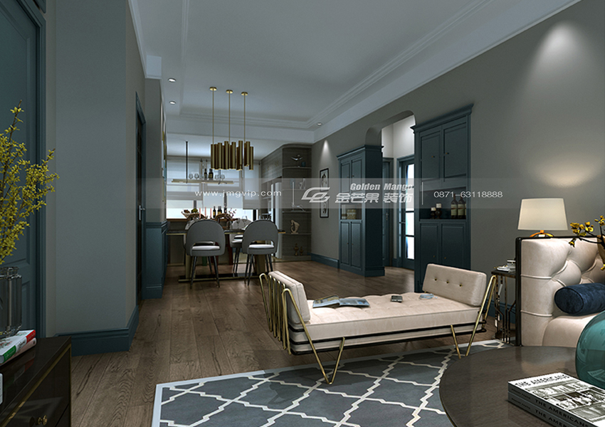 在這個(gè)案例中,一抹淺綠色貫穿著整體。美式風(fēng)格總是給人自由、隨意不羈的生活態(tài)度。在點(diǎn)滴之處也融入了些許巴洛克風(fēng)格的裝飾,奢侈、高貴。