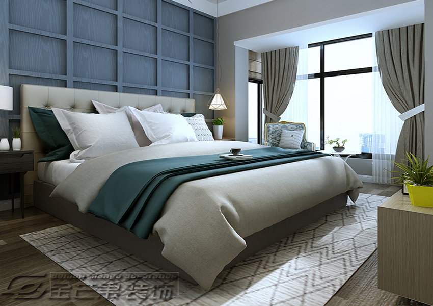 臥室舒適、實(shí)用。整體以色彩搭配來營造溫馨的視覺感受,木質(zhì)的地板,窗簾顯得質(zhì)樸。