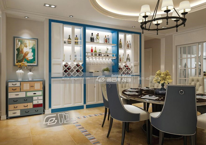 圓形餐桌、吊燈、燈帶預示著美美滿滿、團團圓圓。凹凸有致的椅子顯得高貴優(yōu)雅,柜子上各種酒是抒情的重要催化劑,伴隨浪漫結(jié)束疲勞的一天。