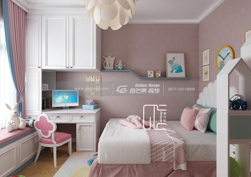氣質(zhì)滿滿的女兒房,嫩嫩的粉裝點著房間,也裝點著少女心。吊燈美感十足。
