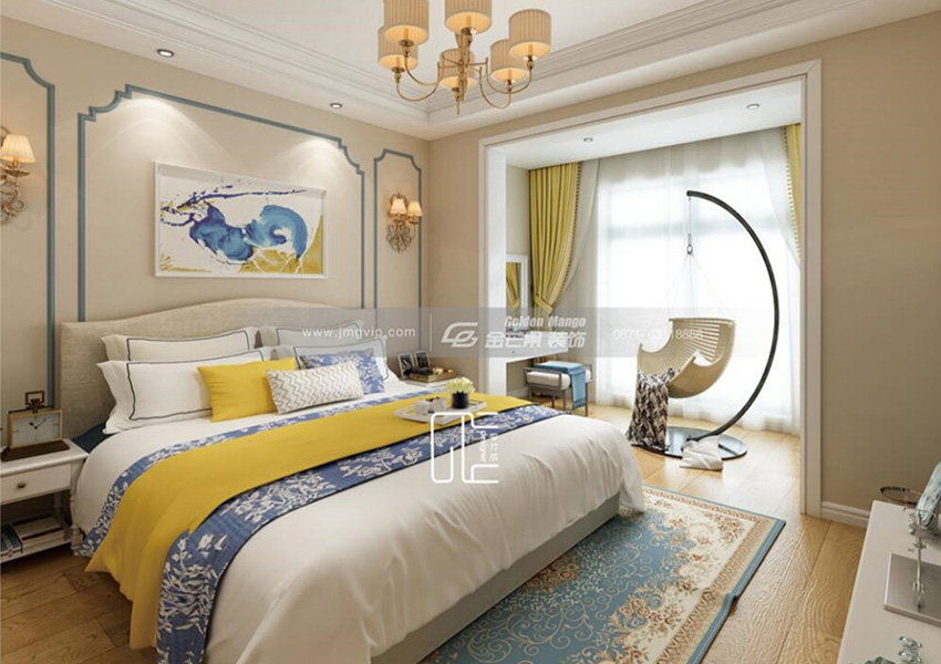 臥室顯得干凈清爽,也有著濃濃的風土情懷,壁燈的設計富有格調(diào),在燈光的映襯下顯得溫暖十足,陽臺的吊椅寄托著隨性的靈魂。無處不舒適,無處不休閑。