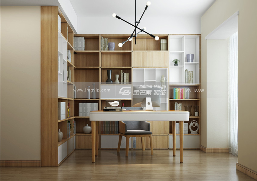 書房則是遵循簡單原則,柜體上以多個格子隔開,分類上更加清晰明了,落地窗提供了個更好的采光性。許多木材的元素更加富有質感。