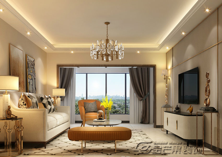 在客廳的設計上以暖色系燈光渲染整個空間,舒適溫暖。吊燈設計別具一格,搭配燈帶、射燈、壁燈。金色鑲邊的家具、飾品有著巴洛克的味道。色彩沒有復雜的搭配,色系上較為統一。