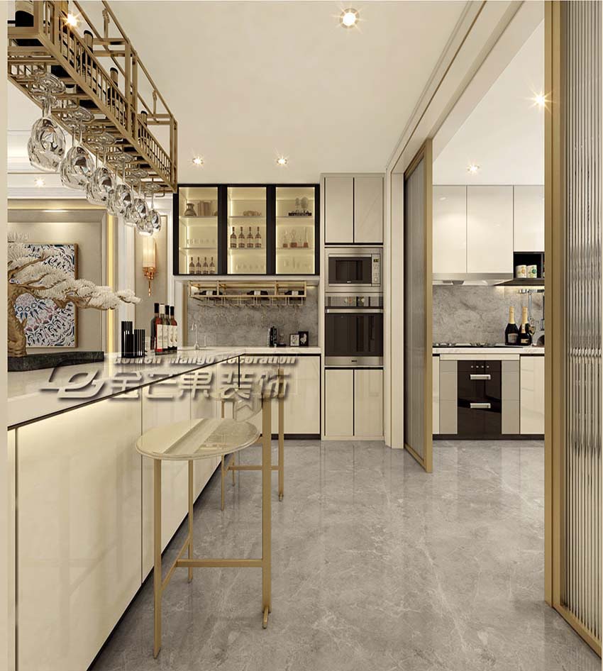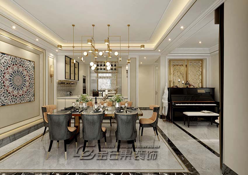 開(kāi)放式的廚房,搭配上乳白色的柜體,更顯高貴、實(shí)用。設(shè)置有吧臺(tái),存有很多珍藏的美酒,一飲而盡也是極致享受。餐廳的座椅則是巴洛克的體現(xiàn),坐感更加舒適,琳瑯滿目的吊燈,帶著工業(yè)的風(fēng)格。旁邊的鋼琴,成為演繹音符的最佳地方。