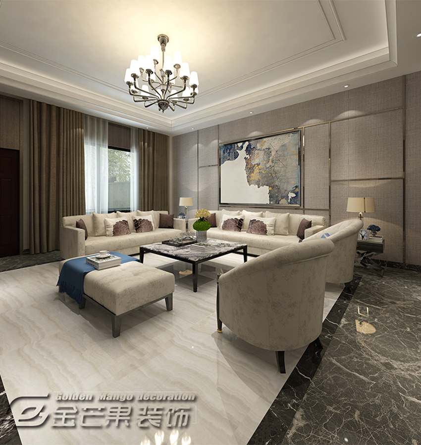 大量的大理石裝飾無疑給整體的品質(zhì)帶來很大的提升,實木包裹的電視背景墻,顯得內(nèi)斂奢華。一抹淺藍(lán)色,清新淡雅,在吊燈上選擇上更顯氣質(zhì),軟裝的優(yōu)雅、貴氣一一顯現(xiàn)。