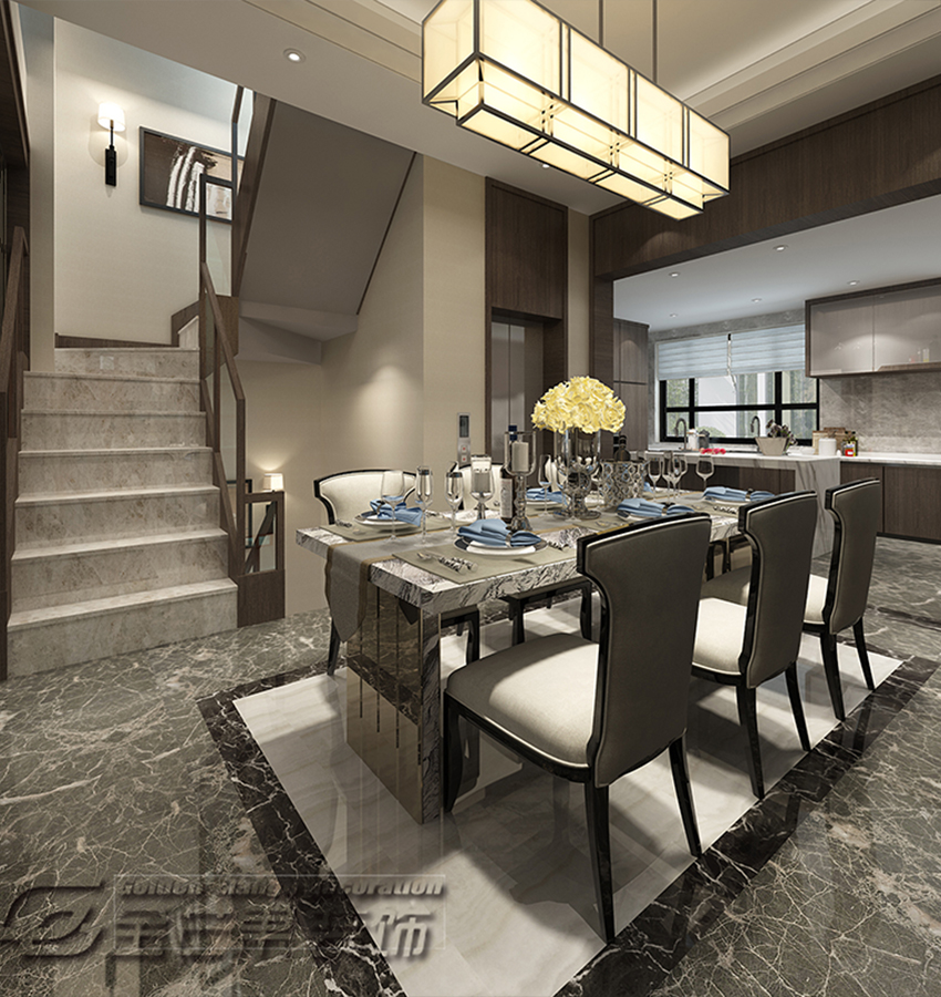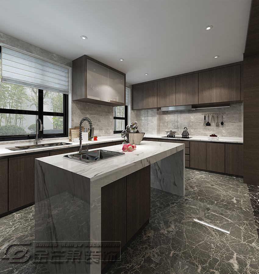 中式元素的吊燈映襯著來自美食的誘惑,一套豪華的餐具,也是對美食的尊重。開放式的廚房、獨立的島臺奢華無比,使用操作方便寬松,大理石鋪成的地面,更是奢華無比。實木制成的柜體質(zhì)感十足。