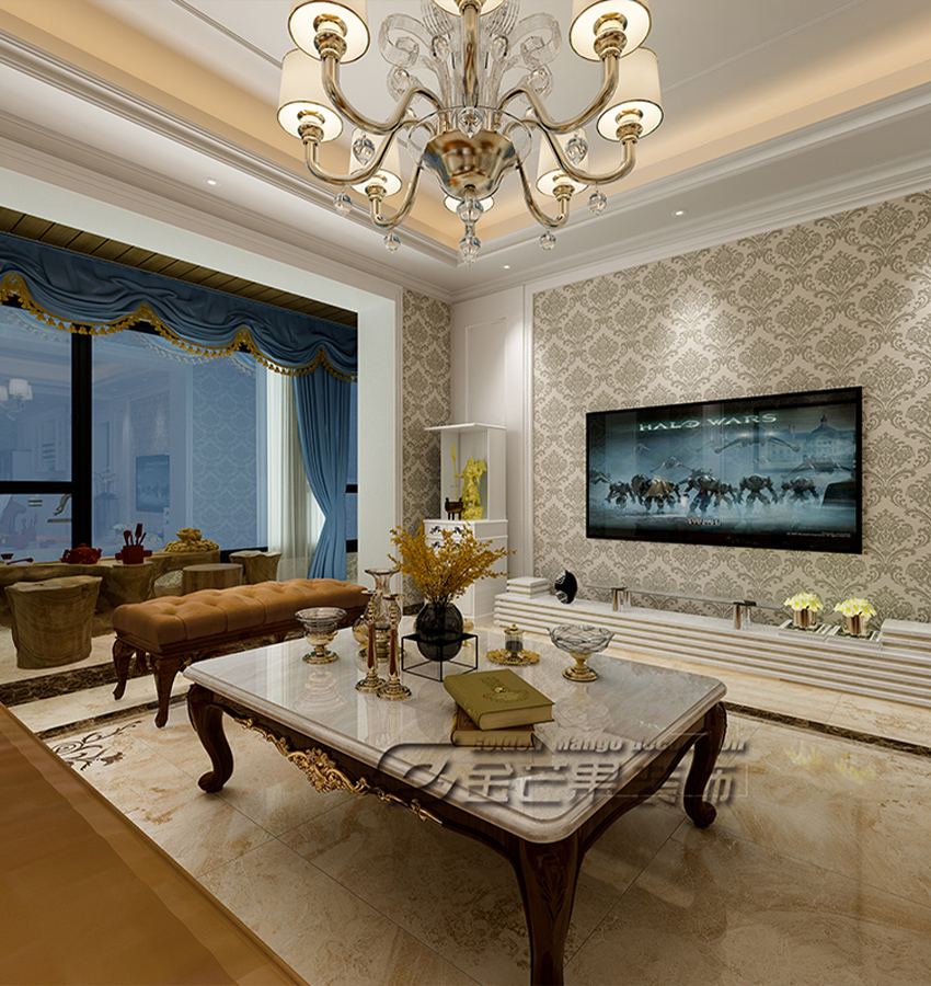 客廳在陽臺處融入了中式元素,好客之道永存于心。陽臺用淺藍色的窗簾和客廳相隔開來,茶幾上的金色雕花透露著巴洛克的味道,地板以契合整體風格的瓷磚,四周搭配上精美的雕花。隨處可見的花紋已成必備。