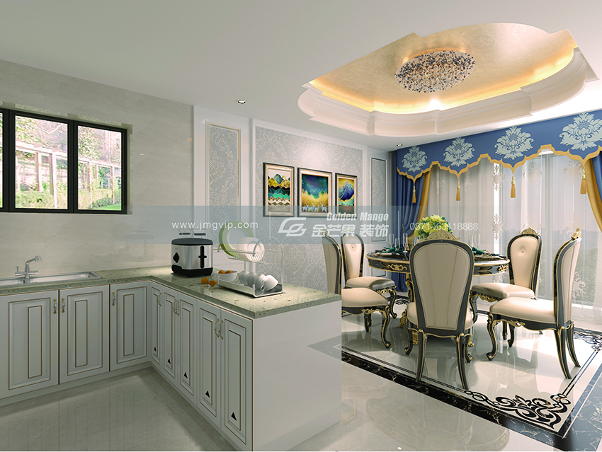 窗簾采用和客廳一樣的,餐廳和廚房以島臺相隔,相互之間有更好的聯(lián)系性和協(xié)調性。圓圓的餐桌和地面上方正的圖案,有相互取長補短的寓意,團團圓圓,方方正正。落地窗和廚房的窗子使廚房更具有采光和通風的優(yōu)勢。開放式的廚房不僅僅檔次高端,在使用上也能有更好的體驗。