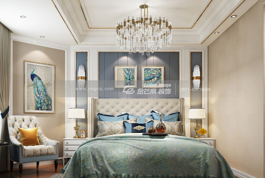 吊燈和客廳有異曲同工之處,光線變得更加柔和。凹陷的吊頂設計,整體空間更顯開闊。一孔雀掛畫和床頭背景的掛畫相互映襯、相互補充。凹凸盡顯質感的床頭加上真皮面料,親膚舒適。旁邊的椅子,悠閑暢想時也是不錯的去處。