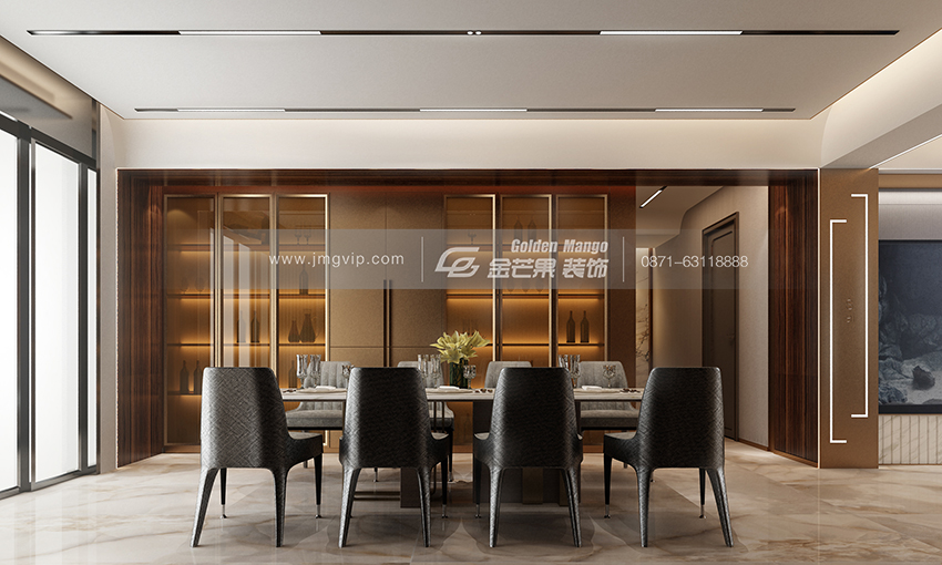 金屬質地的吧臺椅呼應整體空間,墻上的寫意裝飾畫簡而不減,奢而不膩。個性的酒柜設計,讓人忍不住將視線聚集在此,空間的豐富層次感在此得以呈現。