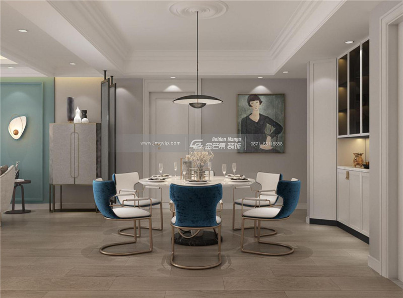 歐式的餐桌椅搭配簡約個(gè)性的吊燈,體現(xiàn)設(shè)計(jì)師的混搭巧思。歐式掛畫和具有東方美韻的大幅裝飾畫背景墻,淡雅又不失藝術(shù)感。間或穿插的金屬和玻璃,挑起靈動(dòng)之美。