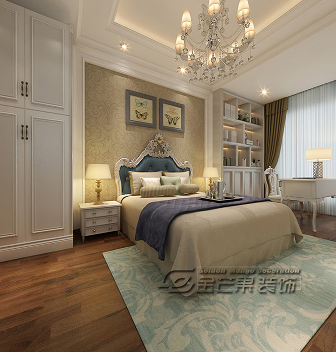 房間整體色調以白色為主,搭配歐式的家具,華麗的吊燈,奢華之感盡顯。房間多選用一些金屬質感的金色家具,增加房間高級感的同時又不顯得突兀。