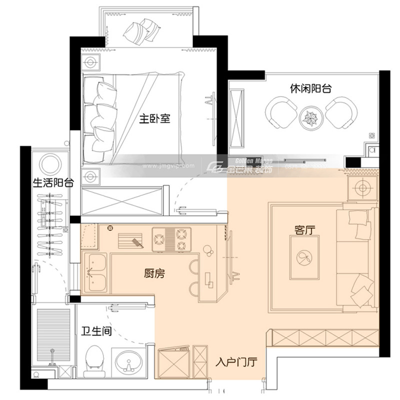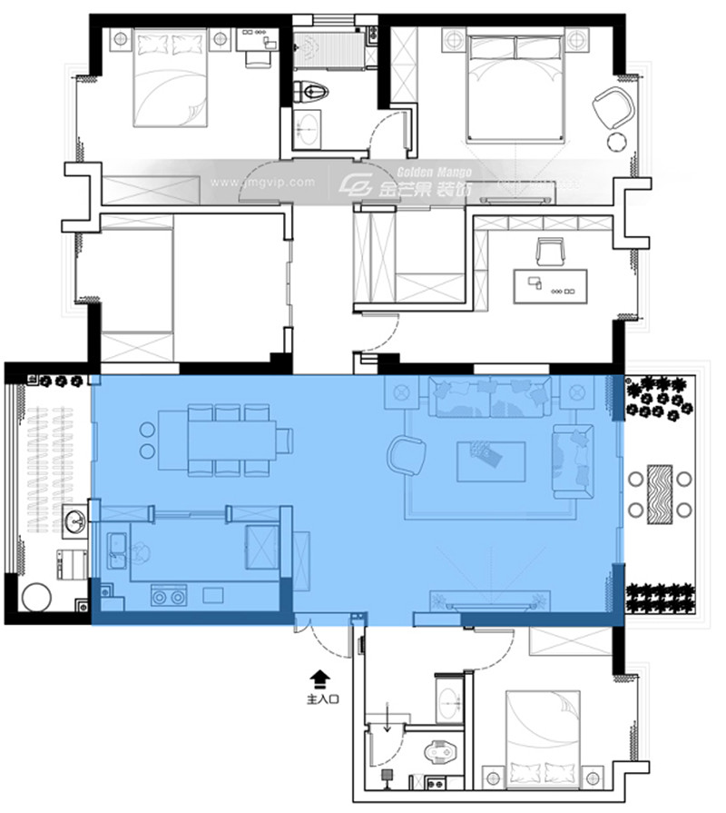 電視背景墻既是隔斷又是操作臺,合理空間利用帶來更多活動區域,豐富空間層次。