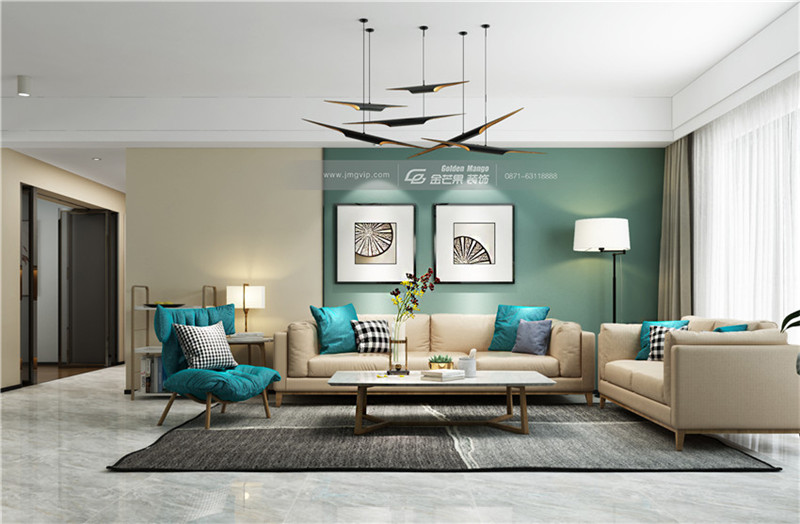 綠色的墻體給人帶來強烈的視覺沖擊,點綴顏色稍亮的抱枕、座椅,優雅但不沉寂,清高但不傲世。點綴清新綠植,一花一世界,隱有暗香浮來,便如置身四季。