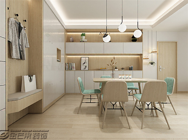 大量原木家具的運用,讓用餐空間寧靜且放松,簡潔的燈飾和柜體符合整體空間簡約、寧靜的美感,輔助光源投下溫柔的光線,細細品味生活的幸福滋味。