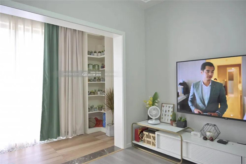 客廳整體空間以淺色系為主,墻面仔細看的話,會發現是很淺的綠色。這樣的綠色就像一顆淡淡的薄荷糖,沁人心脾,又恬靜溫柔。