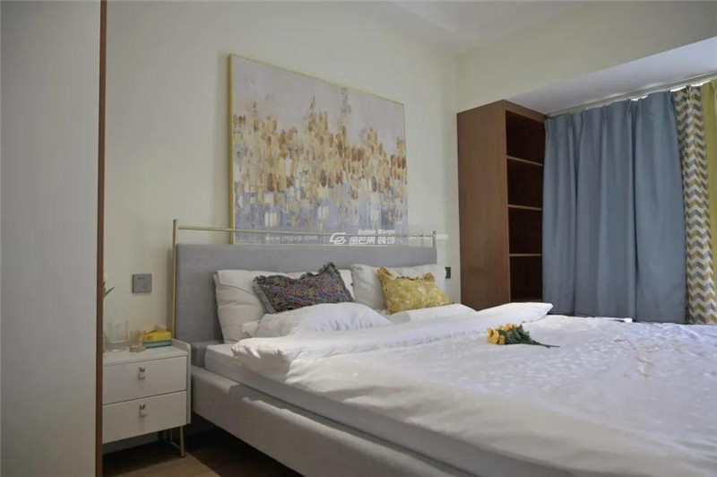床頭設計吊柜,增加收納空間。旁邊的柜體,既可以收納東西,又可以作為桌子來使用,同時可以起到隔斷的作用,這樣的設計讓房間不管是在實用性還是溫馨感上都增加了不少。