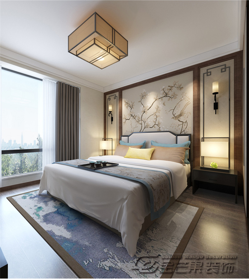 中式的床頭背景墻,豎直方正的線條打造傳統(tǒng)沉穩(wěn)、端莊、大氣的感覺(jué)。中式的吊燈古色古香,提升空間氣質(zhì)。