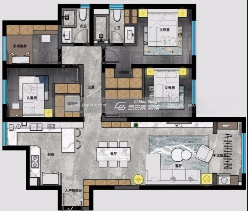 在客餐廳動(dòng)區(qū)的設(shè)計(jì)上,設(shè)計(jì)師將整體空間連通,同時(shí)加入了許多特別的小設(shè)計(jì)。接下來(lái),讓我們來(lái)看看房子客餐廳動(dòng)區(qū)的設(shè)計(jì)效果圖。業(yè)主是一戶六口之家,除了主臥還需要一間兒童房和一間老人房,同時(shí)業(yè)主希望能有一間書(shū)房、一間儲(chǔ)物間以及一間帶衣帽間的主臥。于是設(shè)計(jì)師在原房基礎(chǔ)上進(jìn)行改造,將兩間次臥的一部分分別改為儲(chǔ)物間和主臥衣帽間,以滿足業(yè)主需求,可謂是相當(dāng)巧妙的設(shè)計(jì)。