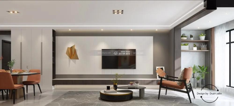 客廳同樣與陽(yáng)臺(tái)連通,客餐廚的整體連通使整個(gè)空間更加通透明亮,令人心曠神怡。電視背景墻采用白灰拼接,增強(qiáng)設(shè)計(jì)感,下方一排電視吊柜實(shí)用美觀且方便打掃。橙黃色飾品和橙色椅子點(diǎn)綴空間,小茶幾同樣趣味美觀,與整體風(fēng)格相呼應(yīng)。