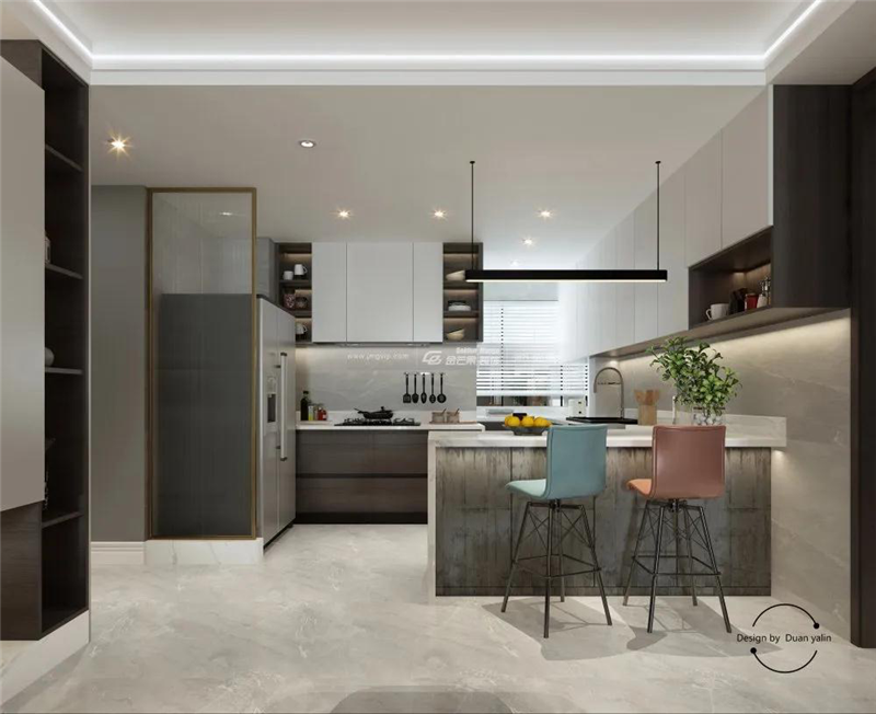 開放式廚房設計,增強與家人的互動性,讓整個廚房都洋溢著幸福的氣息,廚房的整個空間以灰白色為主,墻上兩邊制作了柜子,上邊是白色吊柜,下邊則是櫥柜,整體的櫥柜設計在充分利用空間的同時也突出了整個廚房的一個層次感,小島臺的設計充分利用空間,美觀大氣,整個廚房的做飯動線明確,讓做飯變得輕松起來。