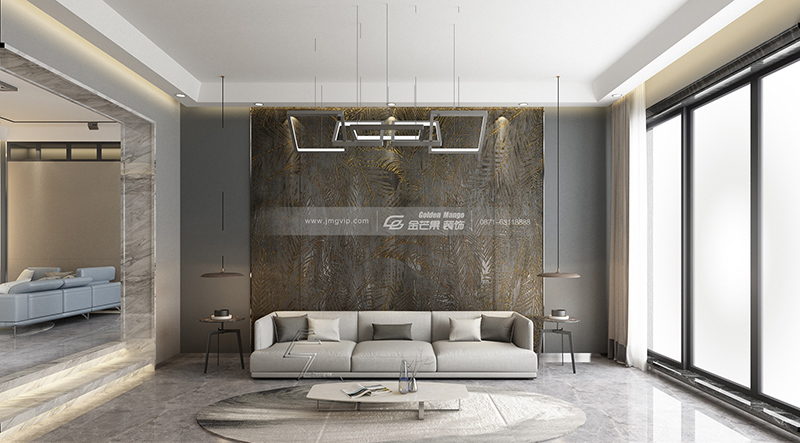 簡潔的沙發,寬大的落地窗,整個空間通透干凈,燈飾讓空間不會顯得過于單調。沙發背景墻上的壁紙大氣、時尚。