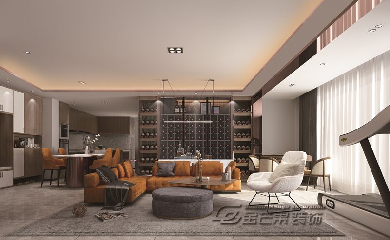 沙發背后一組摩登灰的酒柜中羅列著主人的高級品味,通透的玻璃門在光源的照射下熠熠生輝。