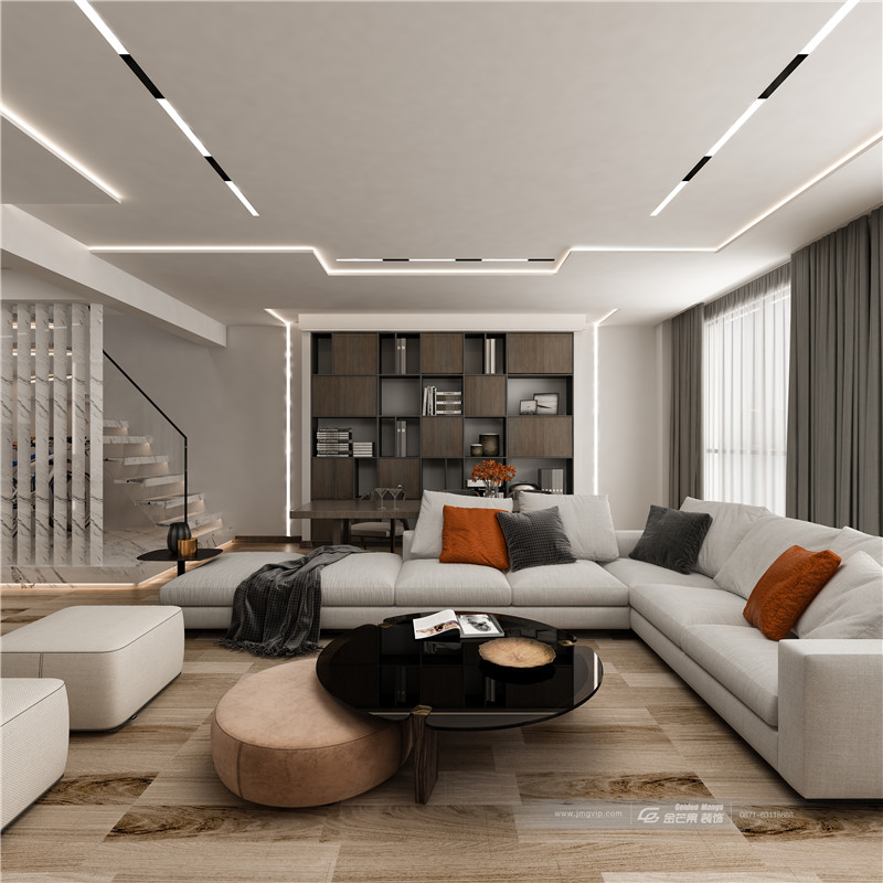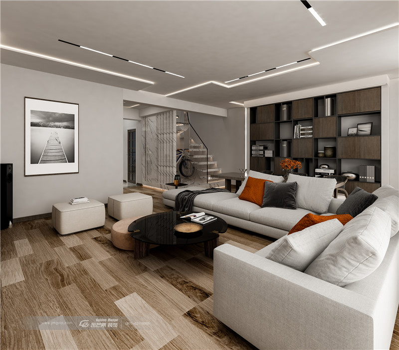 交錯的燈帶是家居個性的展現,獨特的書柜設計層次感立現,拿下一本書,把自己陷在沙發里細細品讀,不管是夏日的陽光,還是冬日的飄雪,都有了如書中般美好的模樣。