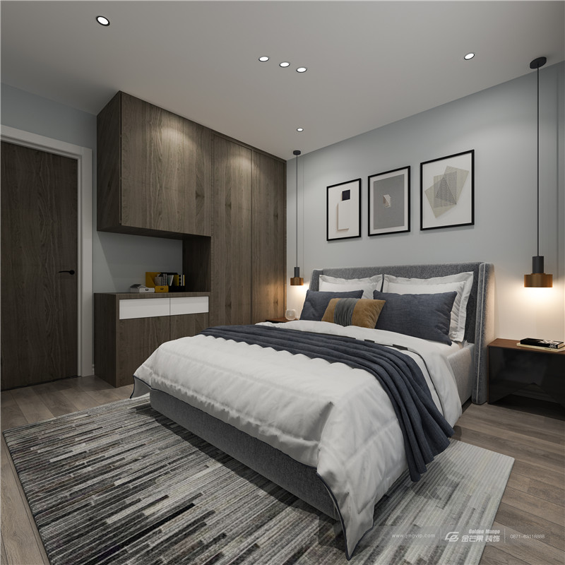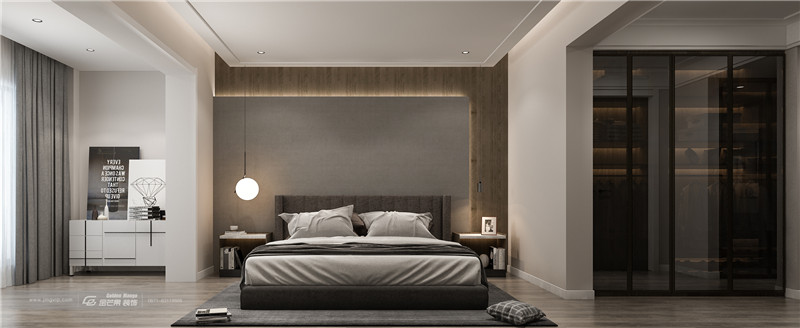 臥室亦是可以很好彰顯品質感的空間,經典耐看的灰色傳達著業主不隨意、不敷衍的生活態度。刪繁就簡,簡單的線條在設計、搭配下,每一處曲動轉折,都有自己的意義。