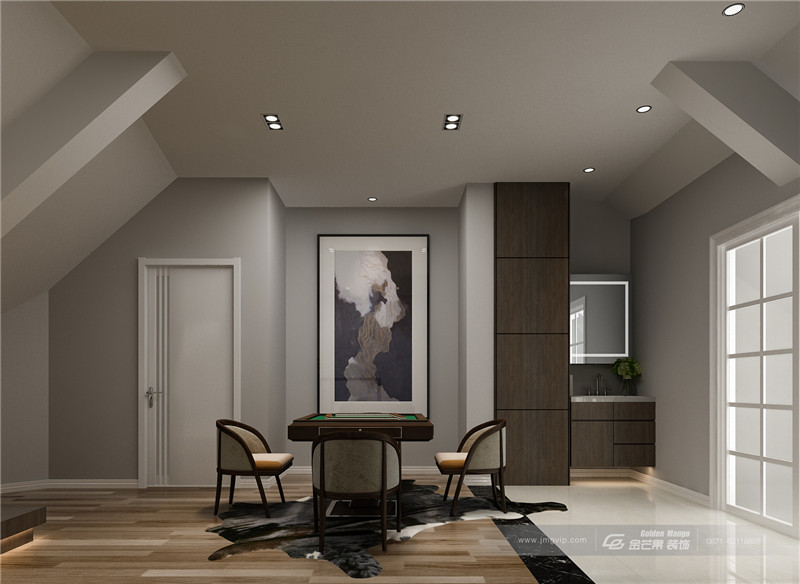 灰色系的大方簡約傳達著平和、淡然的娛樂精神,個性的地板和裝飾畫讓空間個性十足。