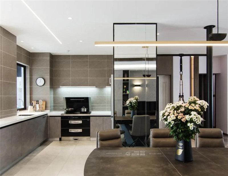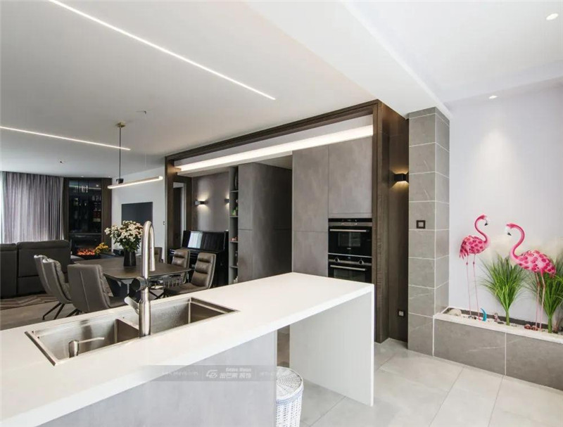 恰如裝修,往往也是一些花了心思的小細(xì)節(jié),最能打動(dòng)人心。廚房區(qū)整體也是灰色的基調(diào),白色的線條提升了層次感。一高一低的臺(tái)面滿足不同身高需求。