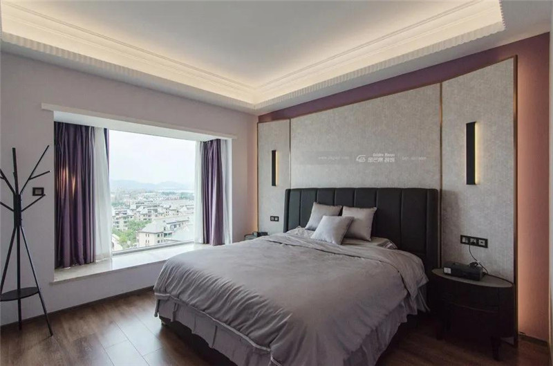 主臥主打的是舒適、氣質(zhì)的格調(diào)。優(yōu)雅的紫色搭配一些金色的鑲邊線條,既舒適又精致感滿滿,彰顯出屋主不隨意,不將就的生活態(tài)度。臥室選用木質(zhì)地板,觸感溫厚,很容易營(yíng)造溫暖感。