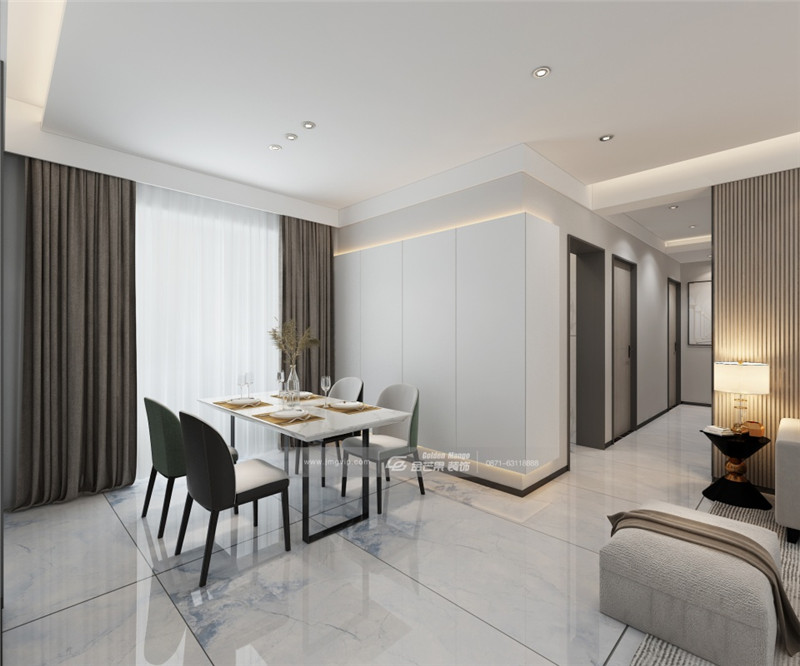 開放式客餐廳空間互動感更強。墨綠色、黑色餐桌椅讓空間有了重心,增加溫暖感,簡約的氣質和整體空間相呼應。