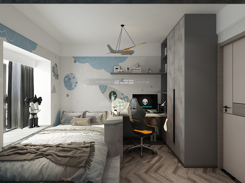 一整面墻的藍色墻布清新可愛,舒適度滿滿。為孩子打造一個絢麗多姿的小世界,滿滿的幸福感。