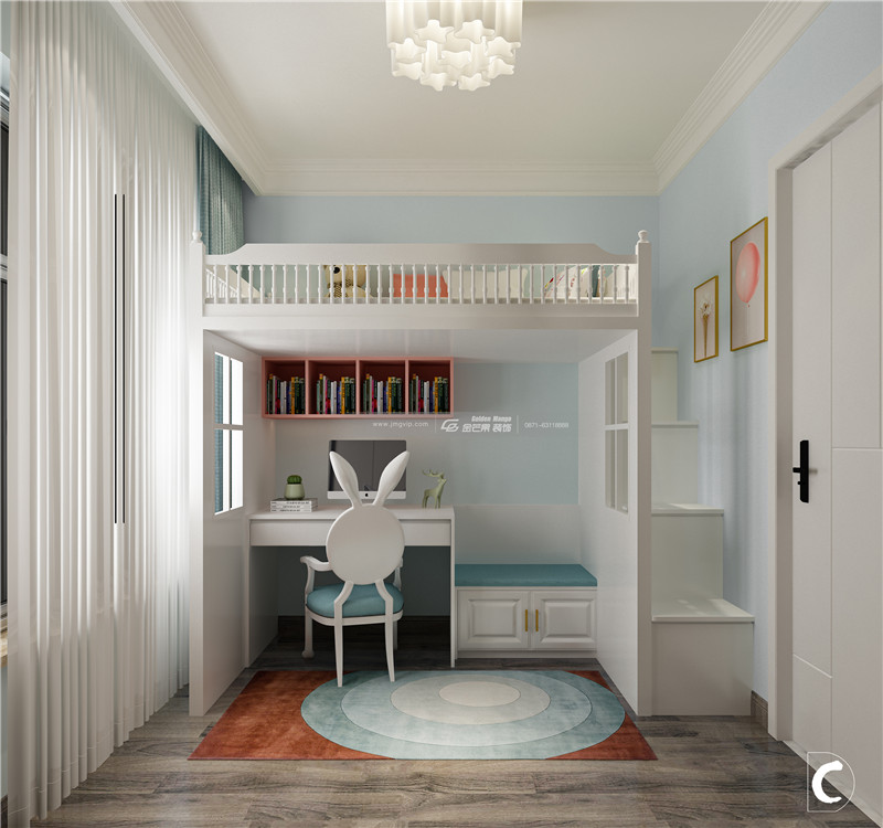 清新可愛的顏色,童趣的家具和裝飾畫,讓房間簡潔、干凈又不失童趣。白色的柜體簡潔純凈,收納功能強大。
